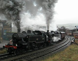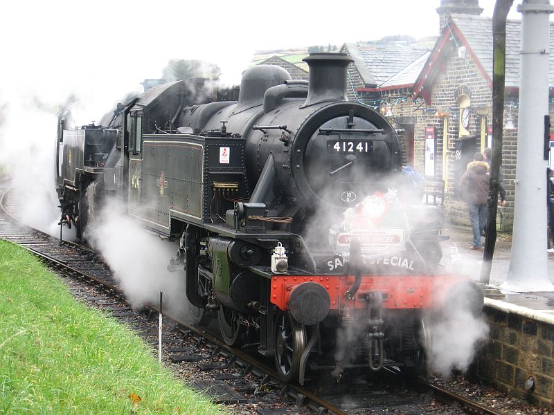 I have seen lots of videos and heard even more recordings of departures from Keighley, which confronts trains immediately with the combination of a steep grade and tight curvature. We are set up on a stone wall at the top of the cutting, about 2/3rds of the way around the curve out of the station. After quick whistles from exLMS/BR Ivatt Class 2 tank 41241 and BR Standard Class 4 tank 80002, the engines start out with cylinder cocks open. These are soon shut, first on the class 2, then on the Standard, and the engines head towards Oxenhope with another train load of happy kids and a class 25 on the rear to save running around at the other end. Sunday 29 November 2009.