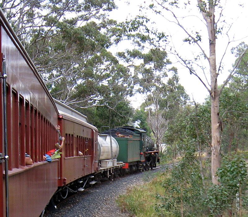 On the run home, when leaving Stanthorpe, the line climbs up steadily to The Summit where it begins the long slow descent down the Silverwood Range back to Warwick. 1089 departs the station with only a little fuss (the official stuff was the day before) and taking it easy through the points for the station loop, we pick up a bit of speed now that we are no longer restricted to 30 km/h. Driver Bill Boden has the Bety well in hand as we make like the mail heading up the hill. Saturday 29th August 2009