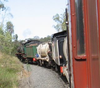Sector 6 of the Q150 Steam Train was to travel the lines of the South West parts of the state. American mikado AC16 221A was the motive power from Toowoomba west to Quilpie, and pacific BB18 1/4 1089 was slated to do the Southern section from Toowoomba to Wallangarra. Obviously, both locos had to get to Toowoomba, so why not double head them from Brisbane! We have had a fast run out through the suburbs and have arrived at Grandchester, ready to tackle the Little Liverpool range. The end platforms of the clerestory roofed cars were all full of happy travellers and with the official Q150 staff and volunteers joining in, there is a fair bit of discussion as we move off. Soon though, the sounds of two locos plying their trade up the hill captivate the passengers and we hear the sounds of the double header making good work of the run to Victoria Tunnel and onwards to Toowoomba. This recording is of the full climb of the Little Liverpool, from Grandchester to the crest at Victoria Tunnel. Monday 17 August 2009 (Photo courtesy of my good friend Terry Olsson)