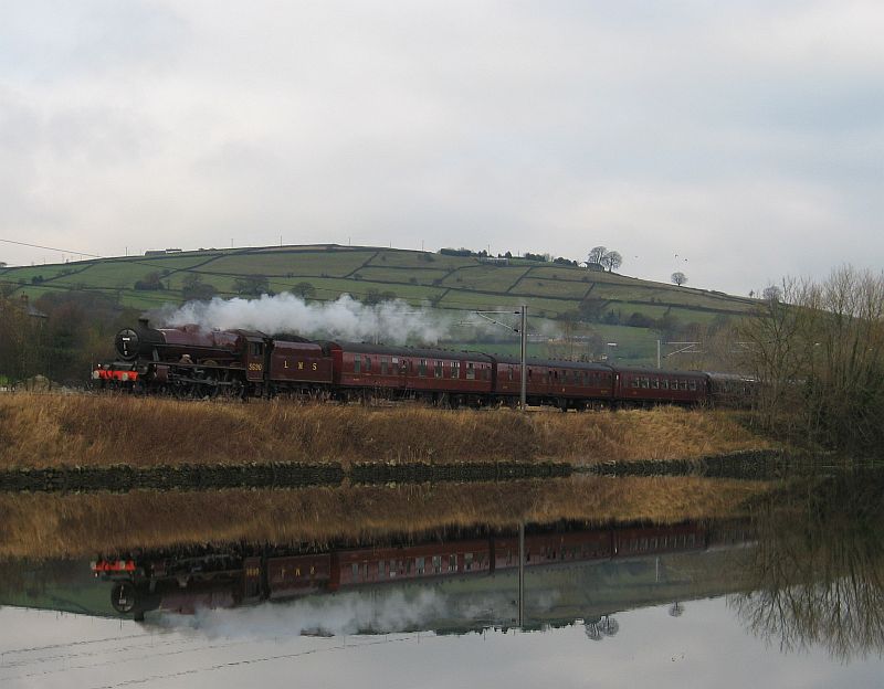 After seeing Sir Nigel in the morning, we headed over to Skipton to see 5690 Leander, the ex LMS Jubilee 3 cylinder 4-6-0 which was also running around the mainline that morning. As is the recordists lot, while we found a great spot at Connelly, for a recording location, it made for an excellent photo (as can be seen below)! As there was very little noise to be had, we spent the rest of the day sight seeing around the the Settle and Carlisle line (Ribblehead Viaduct is amazing!) and Yorkshire Dales. There had been a lot of wet weather in the days leading up to the weekend with considerable flooding and most of the rivers running a banker, so finding dry spots to set up during the day was a bit of a challenge, but at night... In the evening (i.e. any time after 3.45pm!) we headed over to Gargrave, just before Hellifield where we knew the loco would be having a water stop. After searching around in the dark and giving up on one very wet field, we walked along the old canal and set up in a slightly dryer spot just in time to hear 5690 working well upgrade towards Hellifield with the sounds of a nearby river for accompaniament. Saturday 28 November 2009.