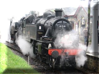 I have seen lots of videos and heard even more recordings of departures from Keighley, which confronts trains immediately with the combination of a steep grade and tight curvature. We are set up on a stone wall at the top of the cutting, about 2/3rds of the way around the curve out of the station. After quick whistles from exLMS/BR Ivatt Class 2 tank 41241 and BR Standard Class 4 tank 80002, the engines start out with cylinder cocks open. These are soon shut, first on the class 2, then on the Standard, and the engines head towards Oxenhope with another train load of happy kids and a class 25 on the rear to save running around at the other end. Sunday 29 November 2009.