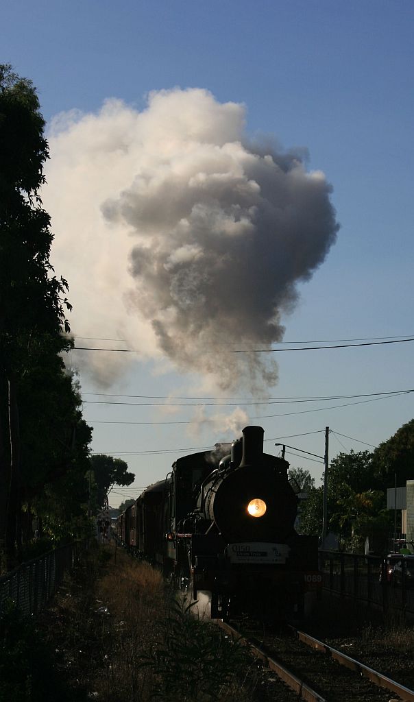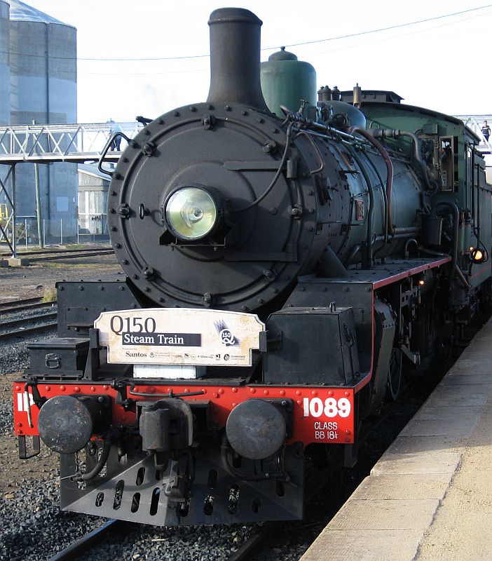 The State of Queensland was gazetted in 1859 by Queen Victoria (hence Queensland) and 2009 is the 150th anniversary of the event. Numerous celebrations were held around the state, all relatively low key, but still, at least it was recognised. One of the key events in all the celebrations was the Q150 Steam Train, where Queensland Rail's heritage fleet hauled a train around the state, travelling north up to Cairns and up the famous Kuranda Range, plus north west to Mt Isa and south west to Charleville and Quilpie, and finally as far south as possible to Wallangarra. The train was predominantly hauled by BB18 1/4 Pacifics 1079 and 1089, plus AC16 221A also assisted here and there, and the recently restored English Electric diesel No. 1620 also deputised when steam couldn't make it.