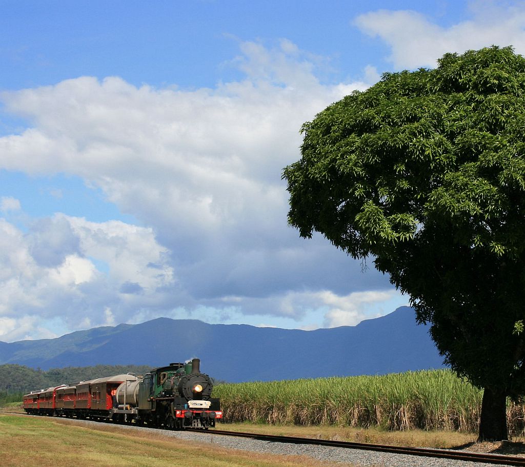 North Queensland is epitomised by a few things, with sugar cane and mangoes just a couple of the elements that make you know you are in the tropics. Here, near Kennedy, we are set up next to a big sugar cane plantation, just across from a huge mango tree. To give some credibility to this picture, this recording opens with the sound of a local farmer going over his occupier level crossing and heading to the fields to do some more work. It was the start of the 2009 crush, so there must have been heaps to do around the farm. Just a short time later, 1089 races past with the Q150 train heading north to Tully and onto Innisfail for the night. 24 June 2009