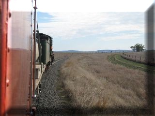 On the run home, when leaving Stanthorpe, the line climbs up steadily to The Summit where it begins the long slow descent down the Silverwood Range back to Warwick. 1089 departs the station with only a little fuss (the official stuff was the day before) and taking it easy through the points for the station loop, we pick up a bit of speed now that we are no longer restricted to 30 km/h. Driver Bill Boden has the Bety well in hand as we make like the mail heading up the hill. Saturday 29th August 2009